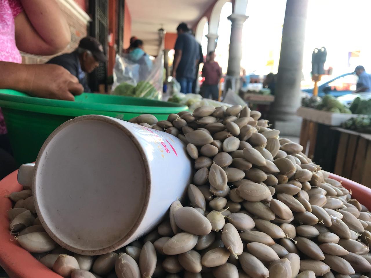 Autlán de Navarro, Jalisco. 3 de marzo de 2020. (Letra Fría) Durante mes y medio, los portales del Mercado Juárez exhibirán tinas cubiertas por parotas, las semillas de aspecto grisáceo que se comercializan en 15 pesos la taza.