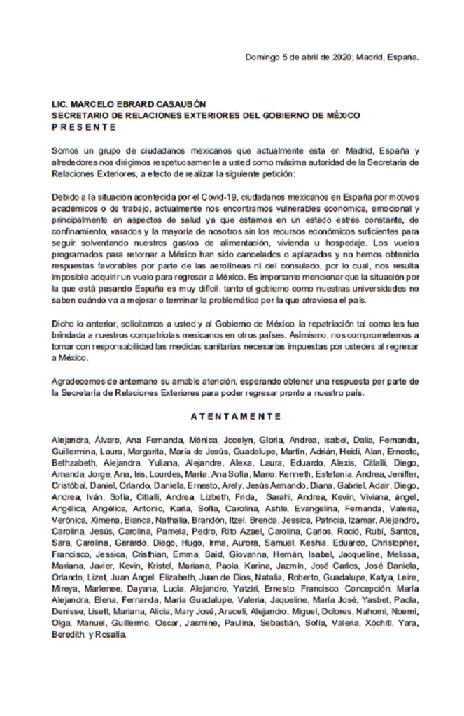 Connacionales de al menos diez estados del país, entre ellos Jalisco, que se encuentran varados en España, dirigieron hoy una carta al Secretario de Relaciones Exteriores del Gobierno de México, Marcelo Ebrard, solicitando ser repatriados. La mayoría son estudiantes y no pueden regresar a México porque los vuelos han sido cancelados. Se encuentran vulnerables económica y emocionalmente, además padecen un estado de estrés constante.