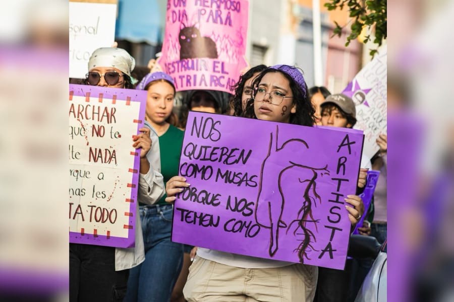 ¡Nos quieren como musas porque nos temen como artistas! o ¡Marchar aunque no falte nada porque a algunas les falta todo!, podía leerse entre las pancartas de las asistentes a la marcha del 8M que convocó a poco más de cien mujeres entre adultas, jóvenes, adolescentes y niñas.