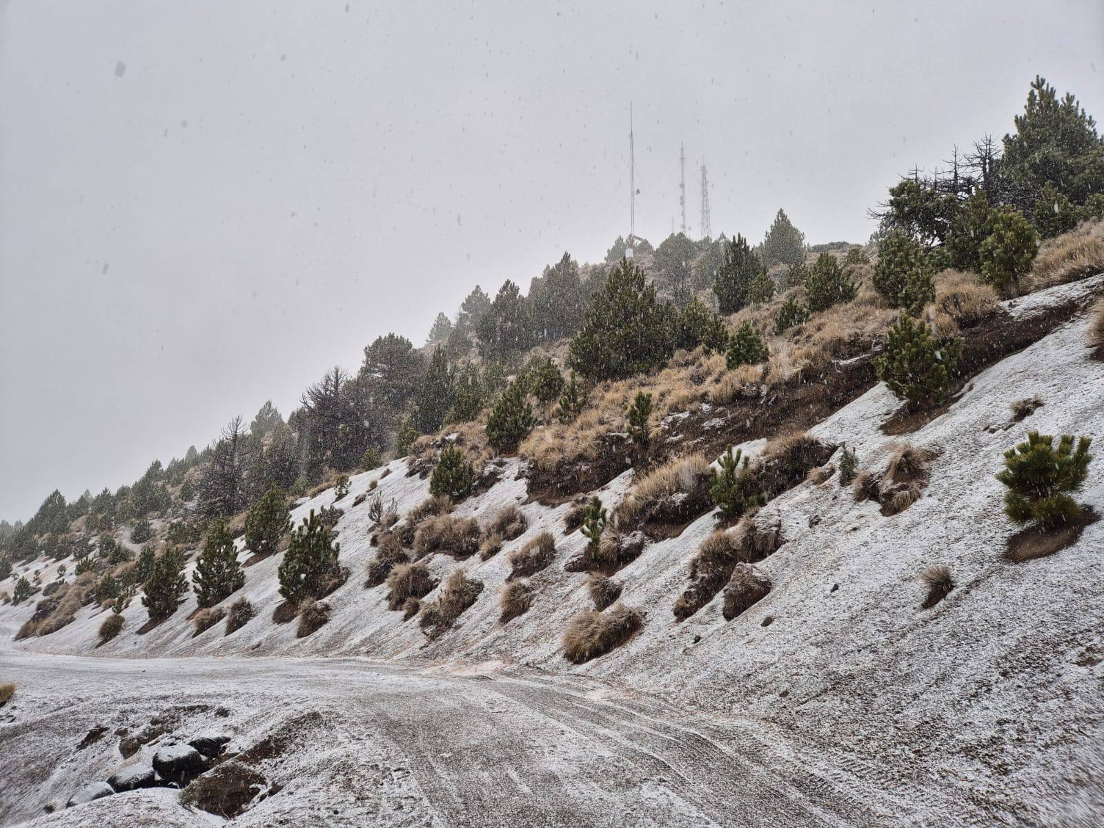 Este viernes se registraron condiciones que propiciaron la caída de granizo y nieve en distintos puntos del Parque Nacional Nevado de Colima, derivado del descenso de temperatura y el alto nivel de humedad.