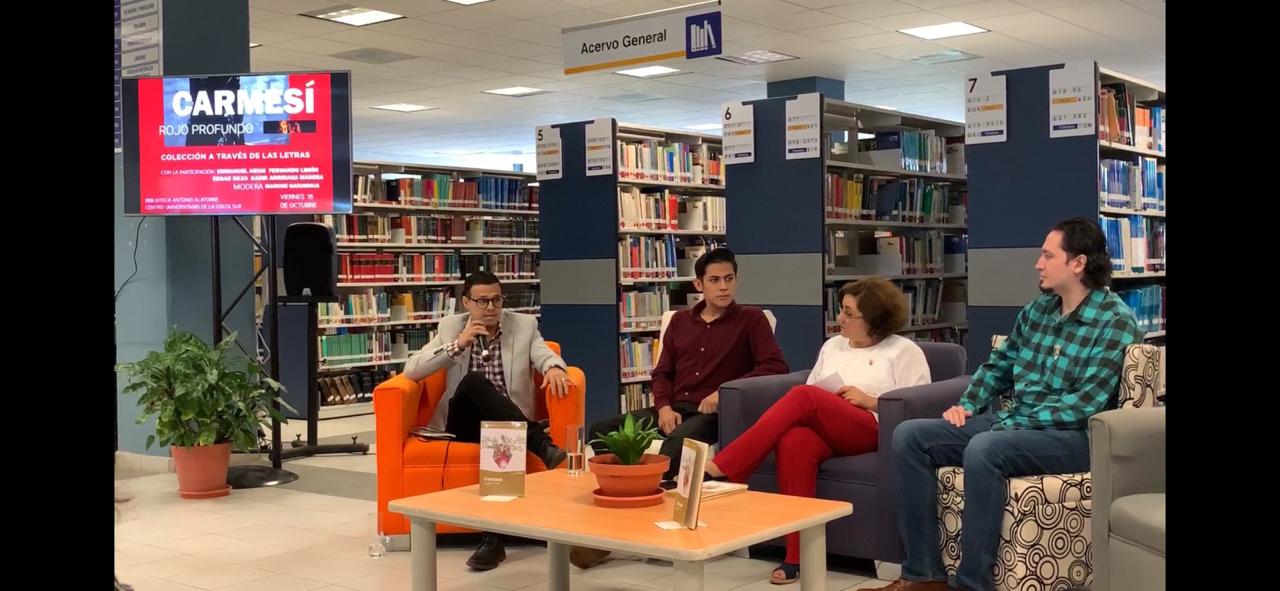 Autlán de Navarro, Jalisco. 19 de octubre del 2019. (Letra Fría) Este viernes, se presentó el libro Carmesí, en la Sala de Lectura General de la Biblioteca Antonio Alatorre, en el Centro Universitario de la Costa Sur, dentro del marco de la XXV Semana Cultural Universitaria.