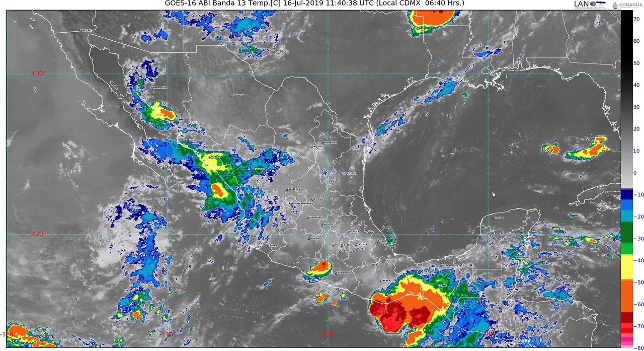 Guadalajara, Jalisco. 16 de julio de 2019. (Letra Fría) Para este día, la onda tropical No. 16 frente a las costas de Colima y Michoacán, interaccionará con un canal de baja presión extendido sobre el noroeste y occidente de México y con inestabilidad en altura; tales condiciones originarán chubascos y lluvias fuertes a puntuales muy fuertes en zonas del noroeste, norte, occidente, centro y sur del país.