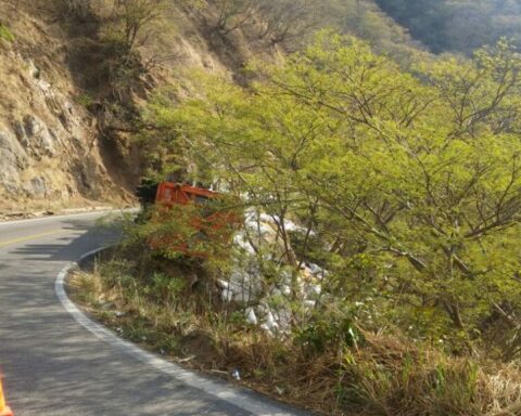 Un camión de la marca Kenworth negro, volcó en el kilómetro 176 + 300 de la carretera federal 80 Guadalajara - Barra de Navidad. El chofer del camión marca Chávez, no pudo controlar el vehículo y al tomar la curva el peso