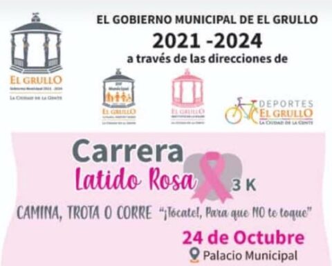 El gobierno de El Grullo realizará la carrera “Latido Rosa” dentro del marco del mes de octubre, mes de la prevención contra el cáncer de mama. Dicha actividad tiene como lema “Corre, Camina, Trota, tócate para que no te toque”.