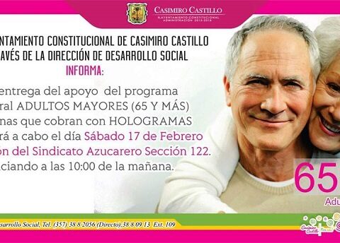 Por: Redacción Casimiro Castillo, Jalisco. 16 de febrero de 2018. (Letra Fría).- La Dirección de Desarrollo Social informa que la entrega de apoyos del programa federal Adultos Mayores de Casimiro Castillo (personas que cobran con hologramas) se llevará a cabo el 16