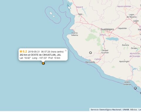 El Servicio Sismológico Nacional reportó un sismo en Cihuatlán, Jalisco, hoy a las 06 de la mañana con 57 minutos y 28 segundos. El sismo fue de 5.2 grados en el escala de Richter a 262 kilómetros al oeste del municipio,