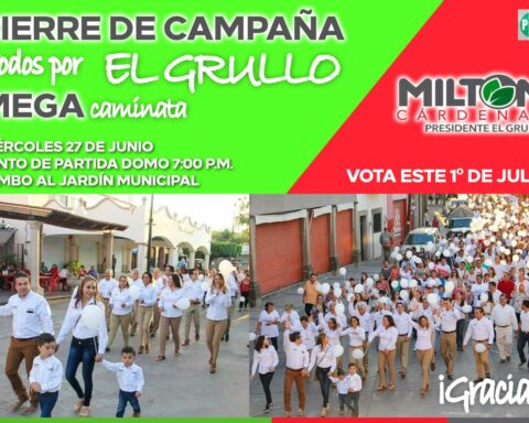 El candidato a la presidencia municipal de El Grullo por el Partido Revolucionario Institucional (PRI), Milton Carlos Cárdenas Osorio cerrará su campaña este miércoles 27 de junio, en punto de las 7:00 de la tarde, con la "Mega Marcha Todos por El
