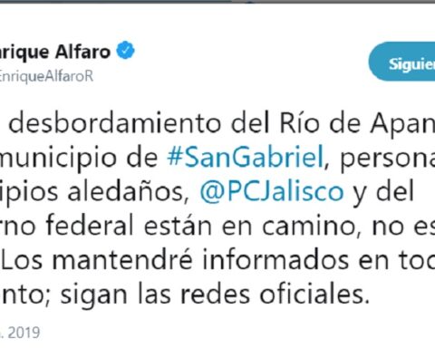 Mediante su cuenta en Twitter, el gobernador de Jalisco envió un mensaje a los pobladores de San Gabriel, quienes son afectados por el desbordamiento del río que atraviesa el municipio. El mandatario les dijo: “No están solos”.
