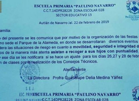 La directora de la escuela primaria “Paulino Navarro”, profesora Guadalupe Delia Medina Yáñez, emitió un oficio a los padres de familia para solicitarles que, durante el carnaval, acudan a recoger a sus hijos puntualmente.