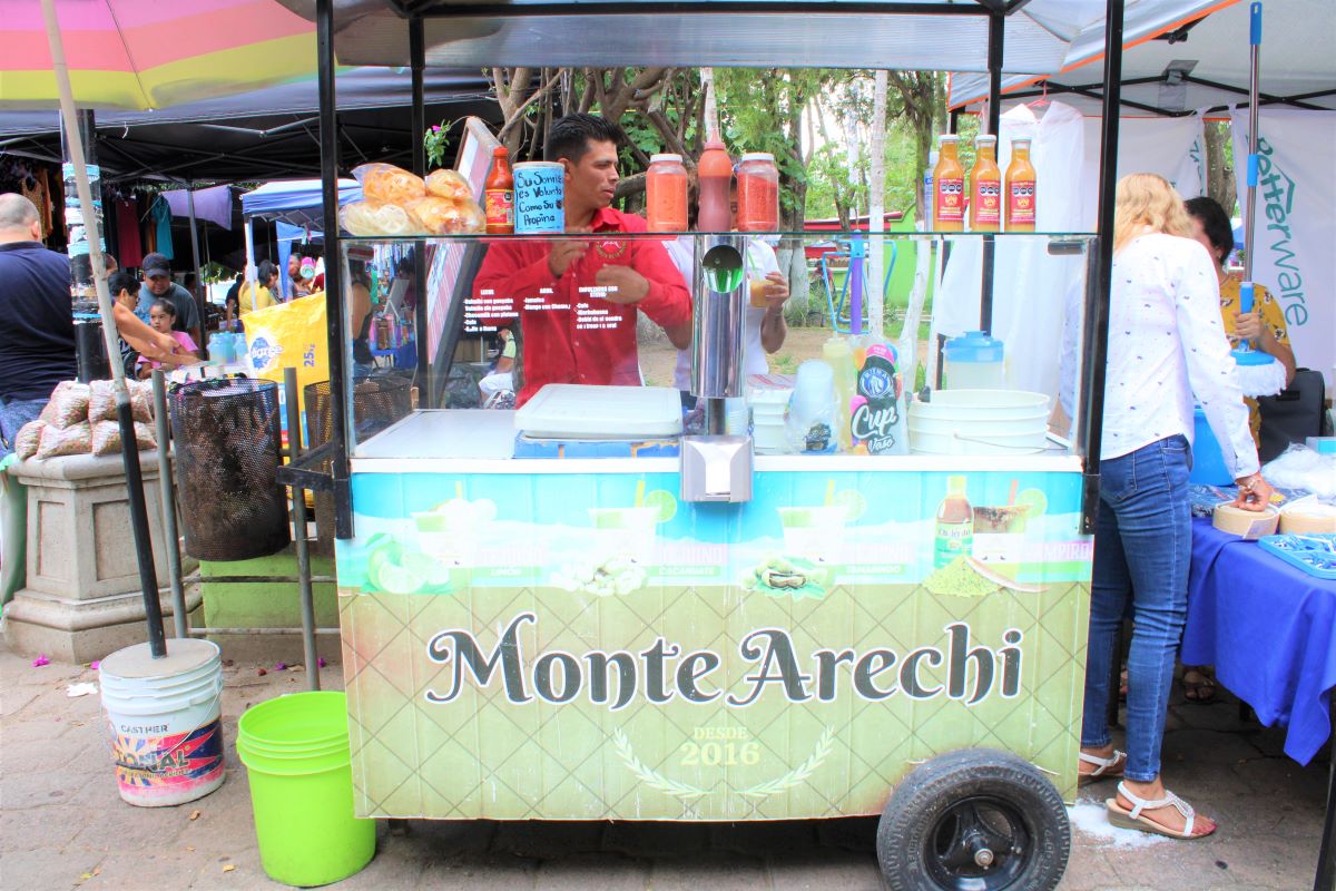 En este caso quien sostiene la jarra, y prepara animosamente el tejuino, es un joven que aparenta tener entre 20 y 30 años de edad. Se trata de Marco Antonio Montes Aréchiga, quien está situado detrás de un puesto con ruedas, que por la parte del frente luce un diseño con la imagen de unos vasos de tejuino, y una letras estilizadas que dicen «Monte Arechi». En el puesto se observa una hielera, vasos desechables, un recipiente con chile en polvo, una botella con chamoy. Una cubeta resguarda el tejuino, bebida que ha estado presente en la familia de Toni por tres generaciones.