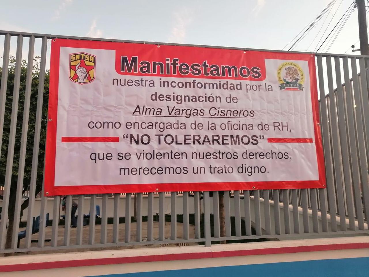 Autlán de Navarro, Jalisco. 20 de abril de 2021. (Letra Fría) Trabajadores sindicalizados del Sindicato Nacional de trabajadores de la Secretaría de Salud colocaron una lona para inconformarse por la designación de Alma Rosa Vargas Cisneros como encargada del Departamento de Recursos Humanos de la Región Sanitaria VII Autlán.