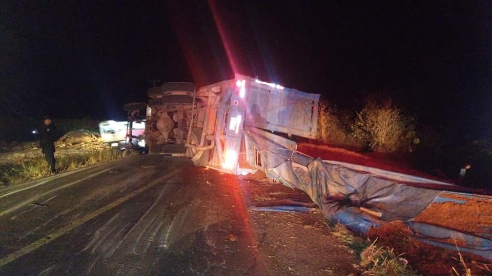 Unión de Tula, Jalisco. 4 de diciembre del 2019. (Letra Fría) Este martes, se volcó un tractocamión que transportaba aserrín. El percance ocurrió a las 20:00 horas, en el kilómetro 120 de la carretera federal 80, a la altura del “Hotel Texas”, informó la Coordinación Municipal de Protección Civil de Unión de Tula.
